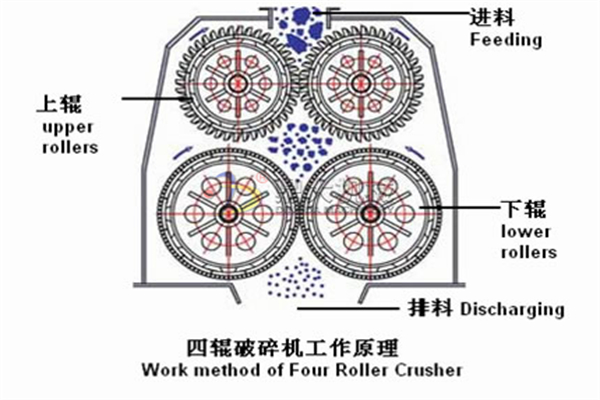 四輥破碎機(jī)是由四個(gè)平行裝置并繞本身水平軸轉(zhuǎn)動(dòng)的圓柱形輥?zhàn)咏M成,由于輥?zhàn)拥霓D(zhuǎn)動(dòng)將物料卷入兩輥的縫隙內(nèi),使物料受壓和研磨而被破碎。