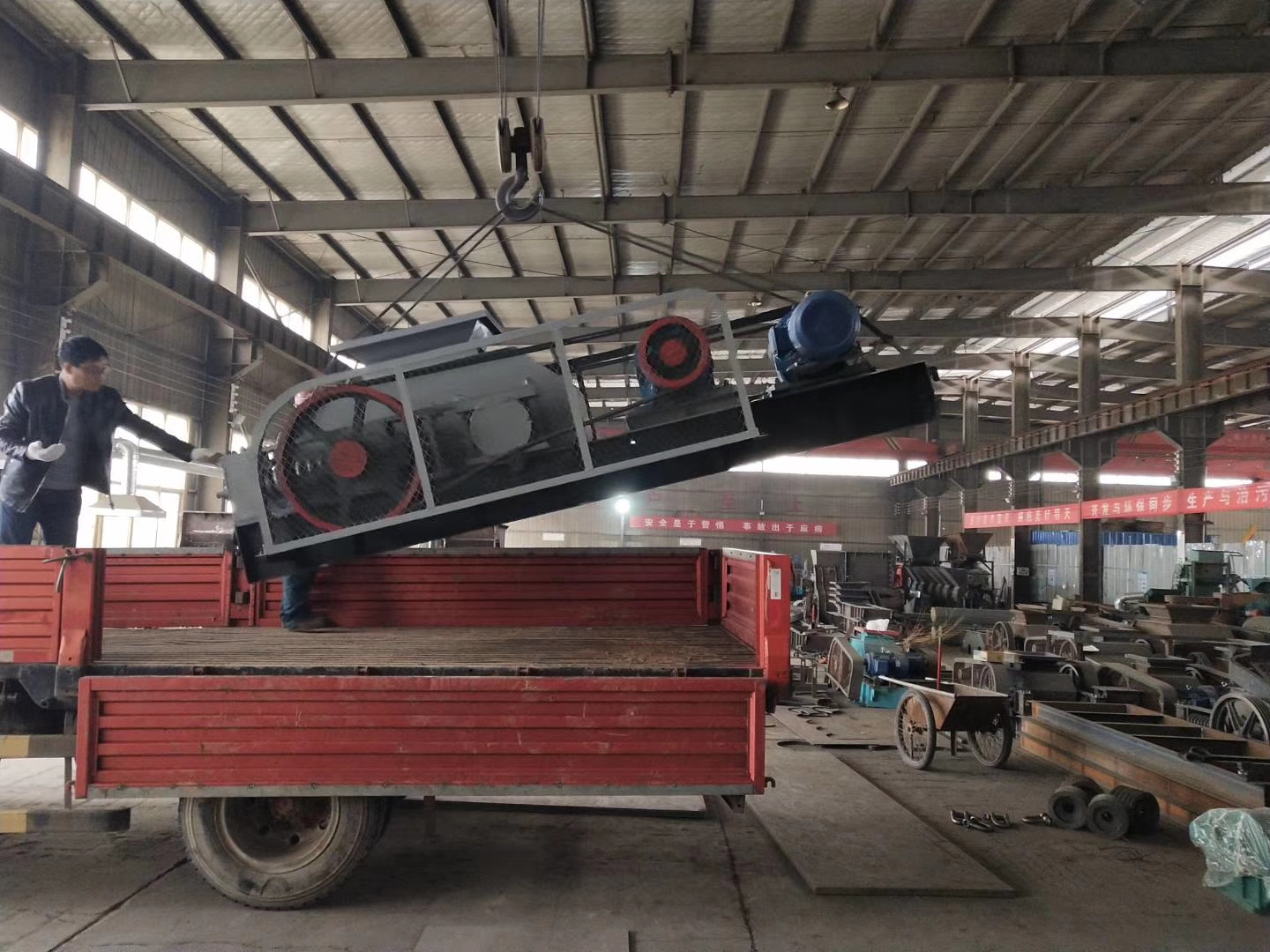 河北保定的客戶殷總在我廠訂購(gòu)的750*500對(duì)輥制砂機(jī)裝車發(fā)貨。